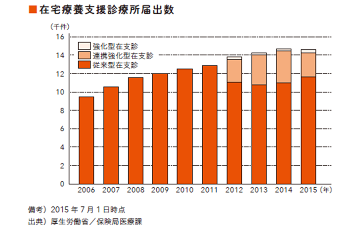 そして2006 年には「在宅療養支援診療所」という在宅医療を行うクリニックの規定が新しくつくられ、2008 年には「在宅療養支援病院」の規定もできました。在宅医療を担うクリニックや病院の施設数は年々増加していて、2017 年5 月現在、全国で1 万7000施設を上回るまでになっています。