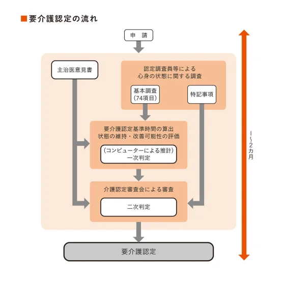 訪問調査の結果と主治医の意見書をもとに、コンピューターによる一次判定があり、さらに介護認定審査会による二次判定を経て、要介護認定が決定されます。(下図「要介護認定の流れ」参照)