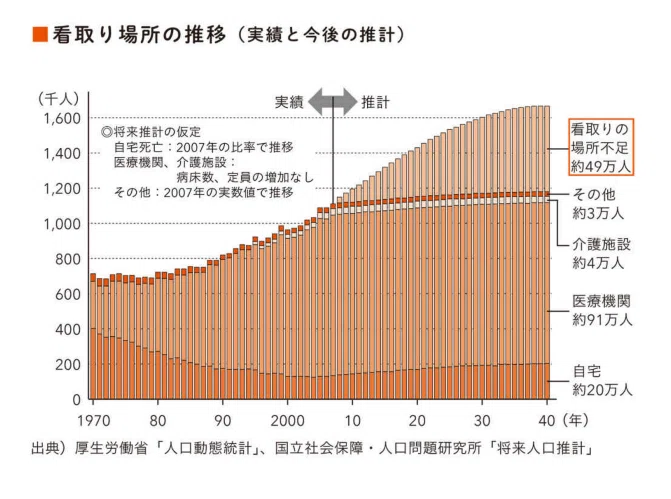 また厚生労働省の試算では、2007年時点での病院死亡者数、自宅死亡者数、介護施設死亡者数がそのまま推移したとすると、2020年には約24万人分、2040年には約49万人分もの看取り場所の不足が発生するとも報告されています。